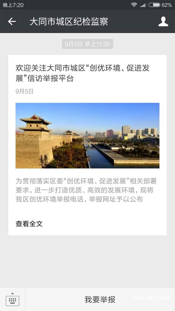 大同城區“創(chuàng )優(yōu)環(huán)境、促進(jìn)發(fā)展” 信訪(fǎng)舉報微信服務(wù)平臺開(kāi)通