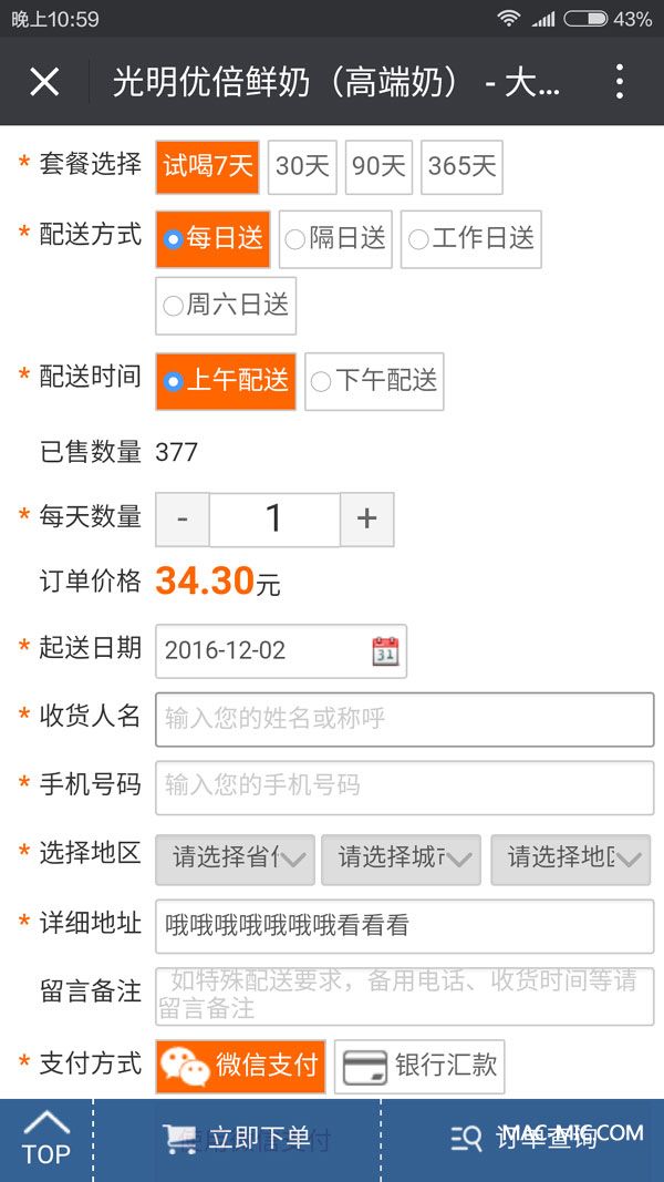 第二步:點(diǎn)擊“在線(xiàn)訂購”,確定訂購數量、價(jià)格、種類(lèi)、起送時(shí)間、配送地址等信息,下單后微信付款。
