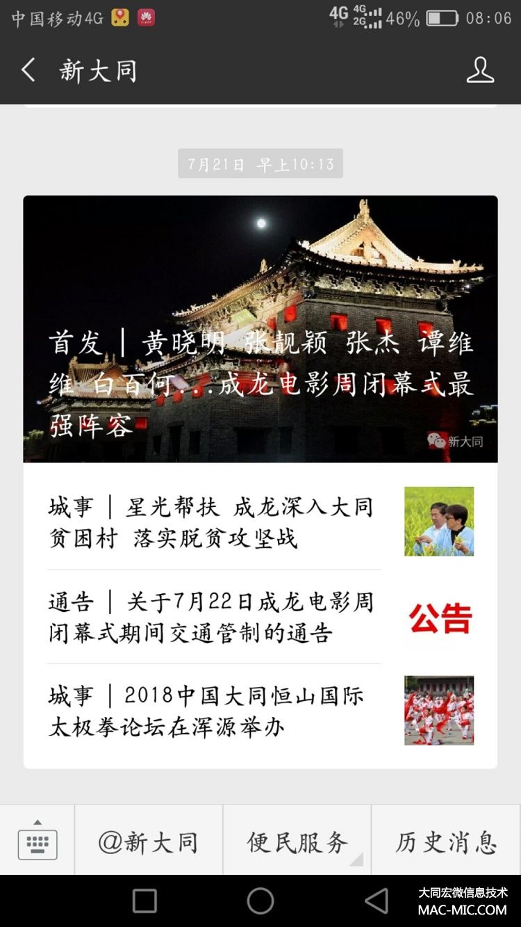 7月21日,由宏微信息技術(shù)旗下新大同微信平臺首發(fā),新大同網(wǎng)、今日頭條新大同號,搜狐新大同號等全媒體陣容推出的《首發(fā) | 黃曉明 張靚穎 張杰 譚維維 白百何...成龍電影周閉幕式最強陣容》一文在網(wǎng)絡(luò )一經(jīng)推出就開(kāi)始熱傳。成龍電影周在大同舉辦,閉幕式廣受關(guān)注,新大同內容發(fā)送及時(shí),內容獨特,編排新穎,受到眾多關(guān)心大同旅游發(fā)展、關(guān)系成龍動(dòng)作電影節的網(wǎng)友一致好評。