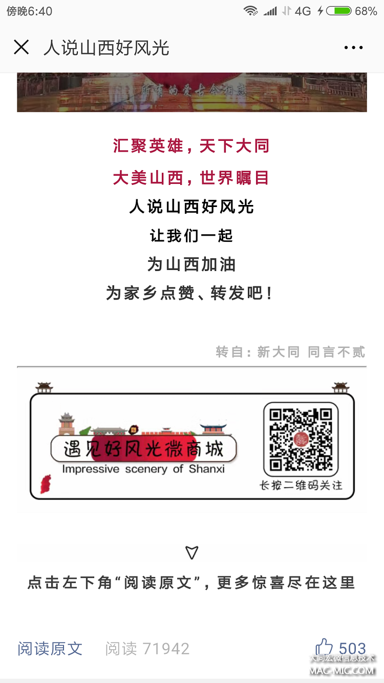 截止發(fā)稿時(shí),新大同原創(chuàng )微文《首發(fā) | 黃曉明 張靚穎 張杰 譚維維 白百何...成龍電影周閉幕式最強陣容》在人說(shuō)山西好風(fēng)光的閱讀量已經(jīng)達到7W+,新大同平臺通過(guò)不斷完善創(chuàng )新發(fā)展,為我們大同旅游、為山西旅游發(fā)展不斷貢獻自己的小小力量。