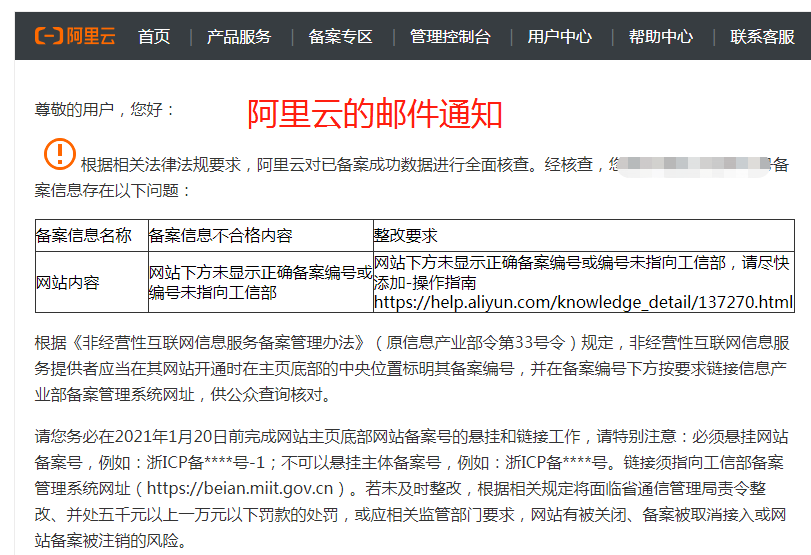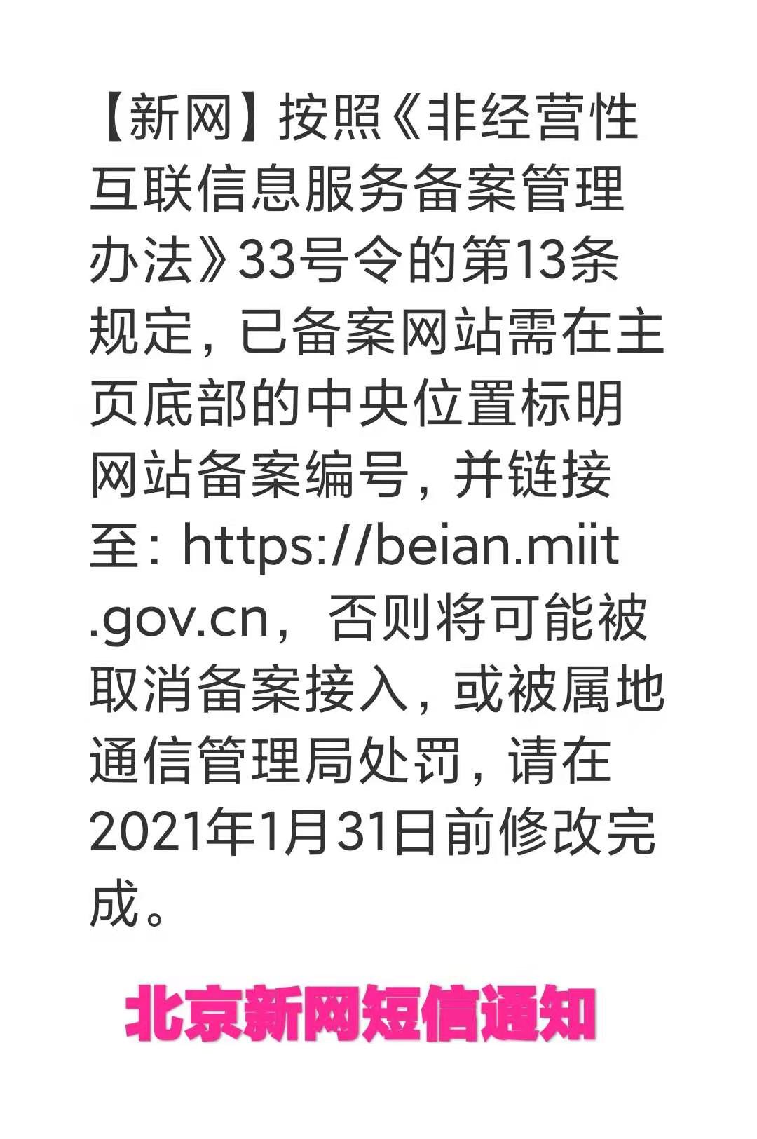請您務(wù)必在2021年1月20日(各接入商要求整改的時(shí)間不完全一致,大體在2021年1月下旬)前完成網(wǎng)站主頁(yè)底部網(wǎng)站備案號的懸掛和鏈…
