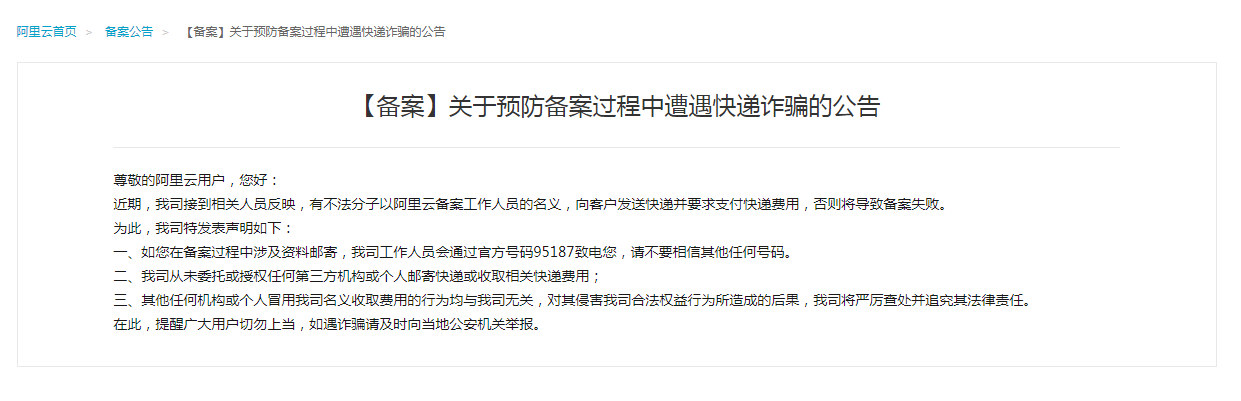 阿里云【備案】關(guān)于預防備案過(guò)程中遭遇快遞詐騙的公告