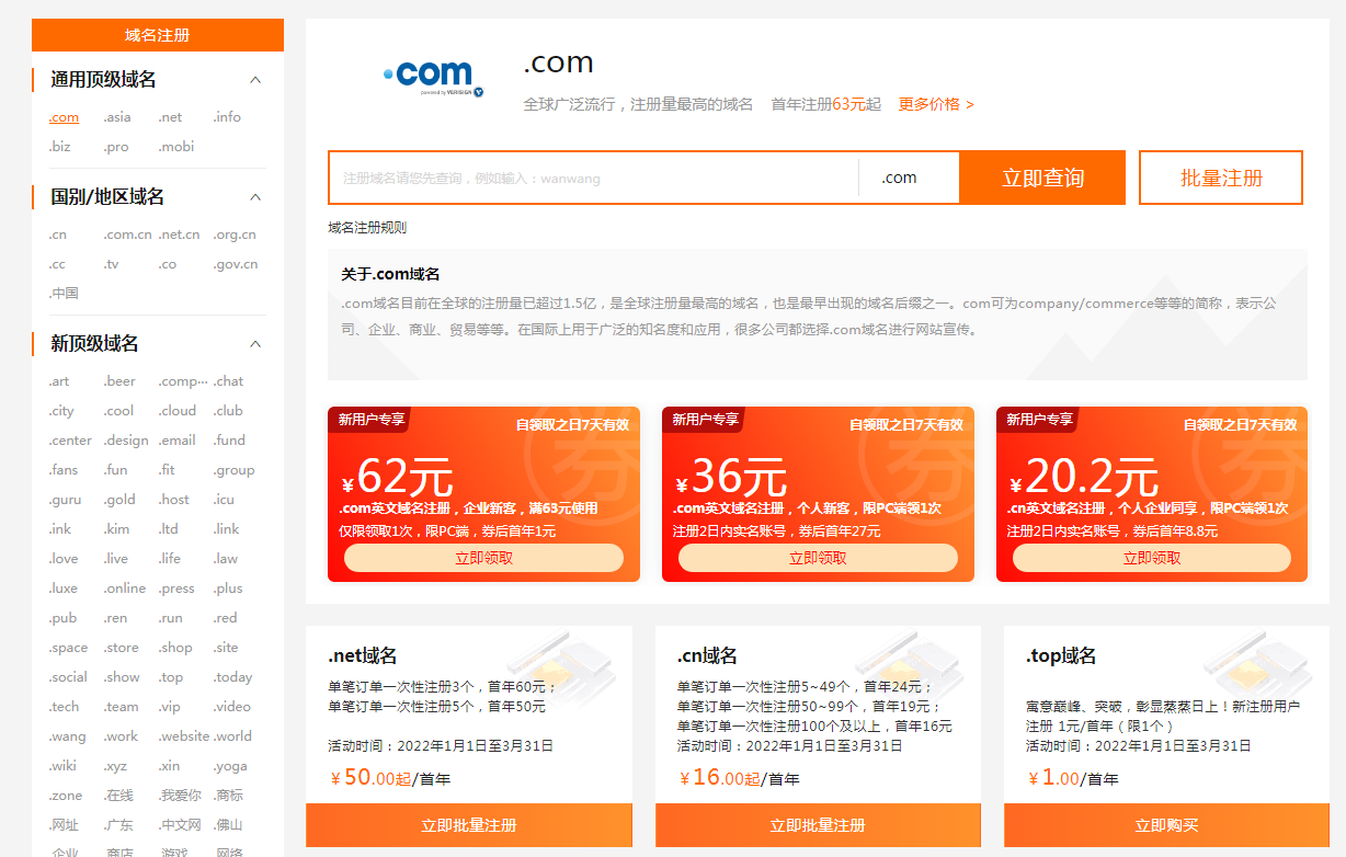 域名(需每年續費) 國內域名注冊商一共也沒(méi)多少家,全國比較知名的就阿里云(以前的萬(wàn)網(wǎng))、新網(wǎng)這些的,其他小的注冊商幾乎都是這些大公司的代理,域名注冊費用每年都在變,但是基本上價(jià)格浮動(dòng)不是很大。